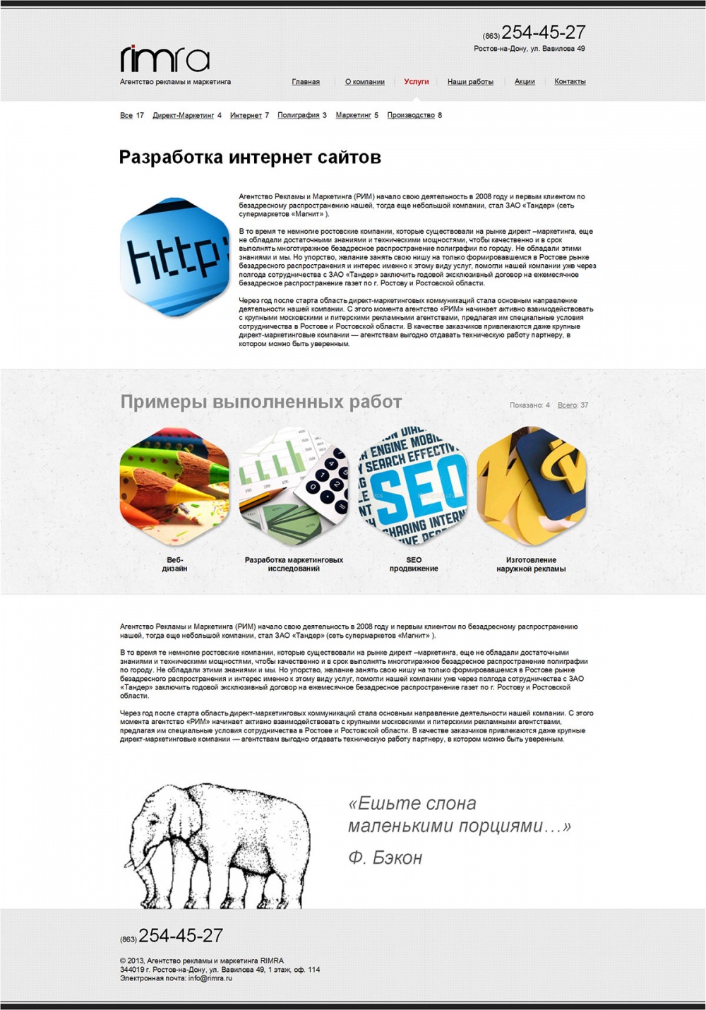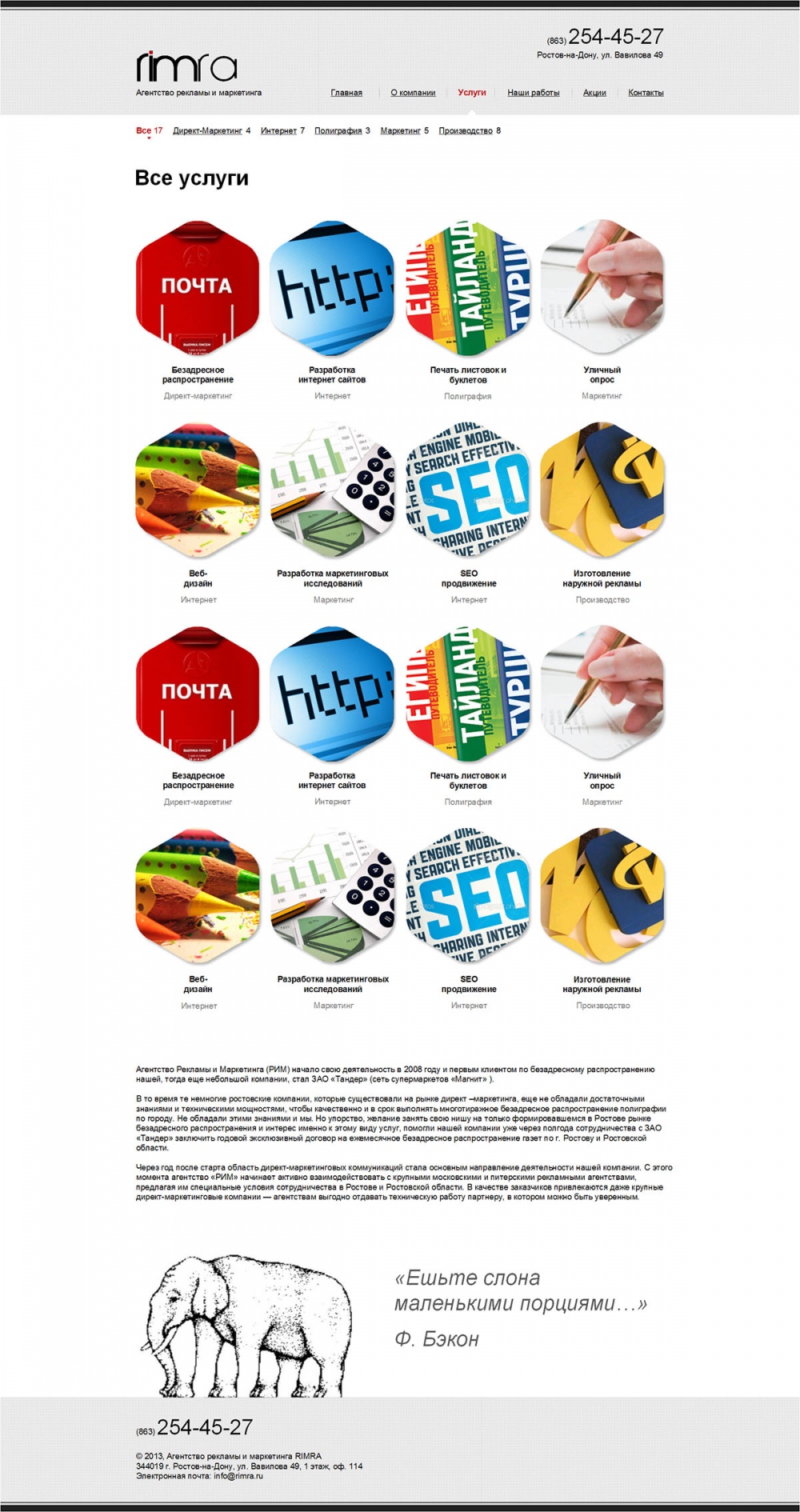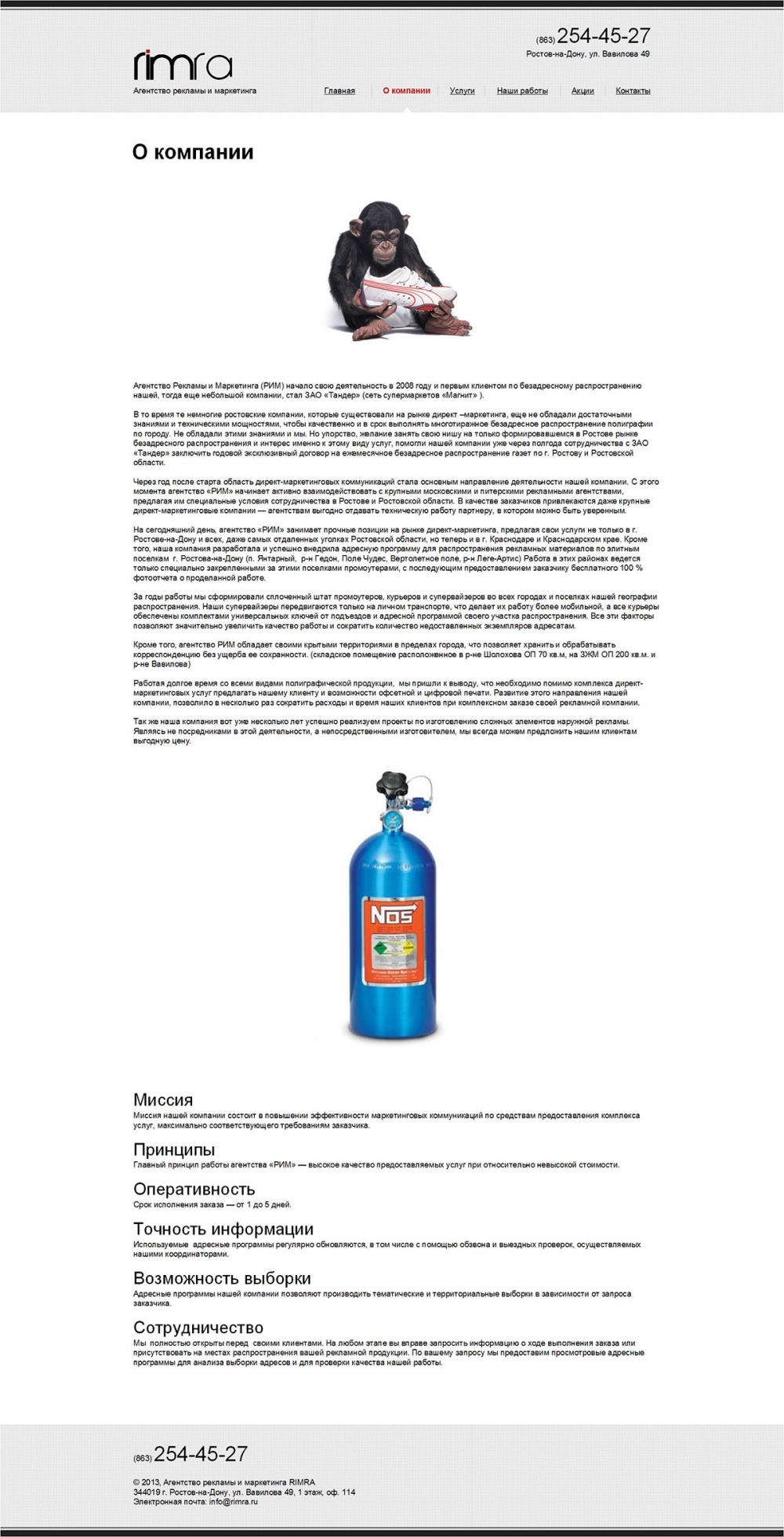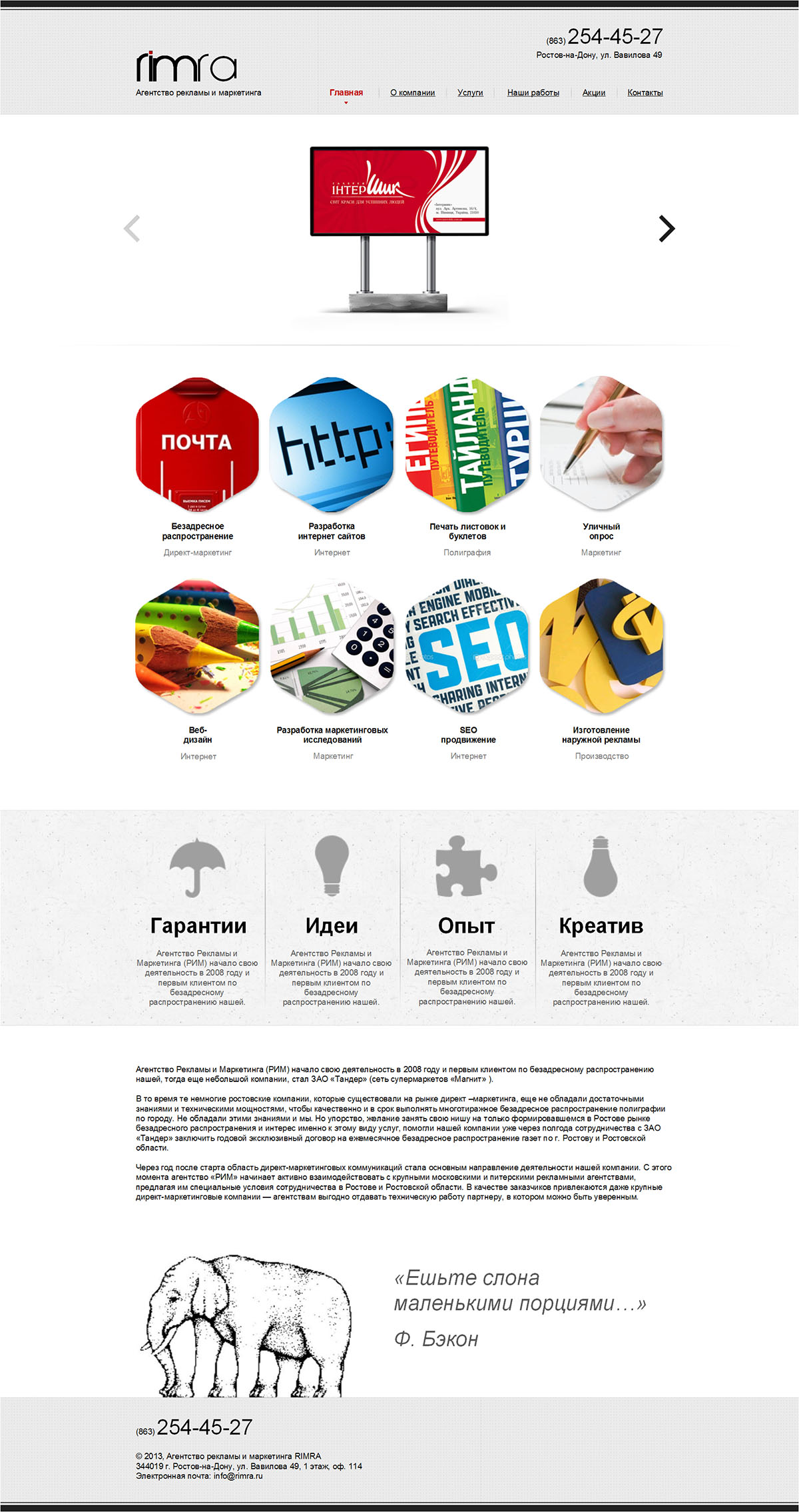 Агентство рекламы «РИМ» - лидер адресного и безадреного распространения на Юге России. Также предлагает услуги в области наружной рекламы, полиграфии, различной сувенирной продукции.