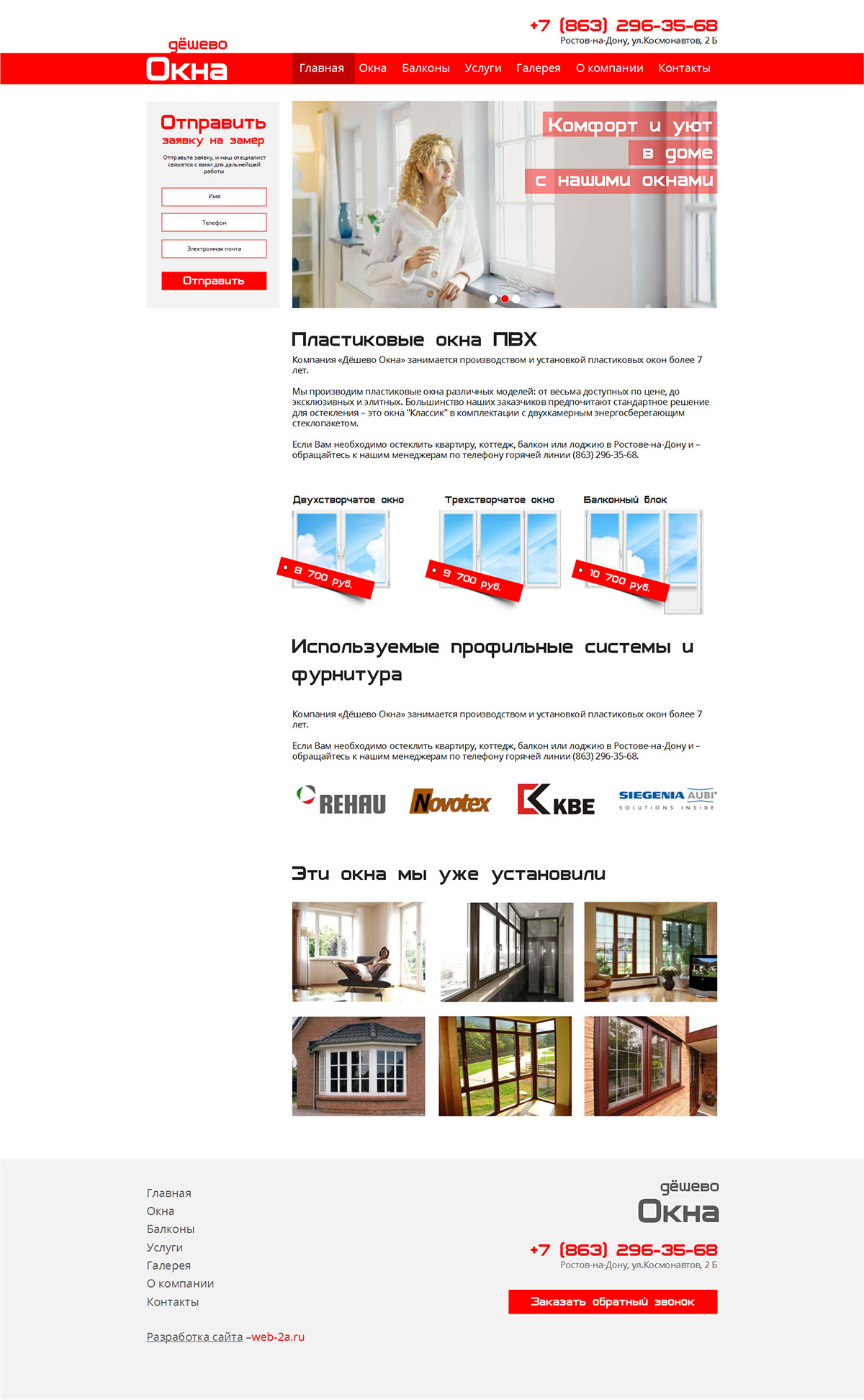 Производтсво и продажа пластиковых окон различных моделей: от весьма доступных по цене, до эксклюзивных и элитных. Компания "Дёшево Окна" занимается производством и установкой пластиковых окон более 7 лет.