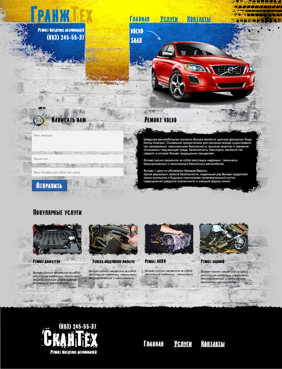 ГранжТех специализируется на ремонте шведских автомобилей. В работе компания использует современное оборудование для диагности��и, регулировки и ремонта автомобилей, а так же современные технологии по оформлению документации и ведению учёта клиентской базы.