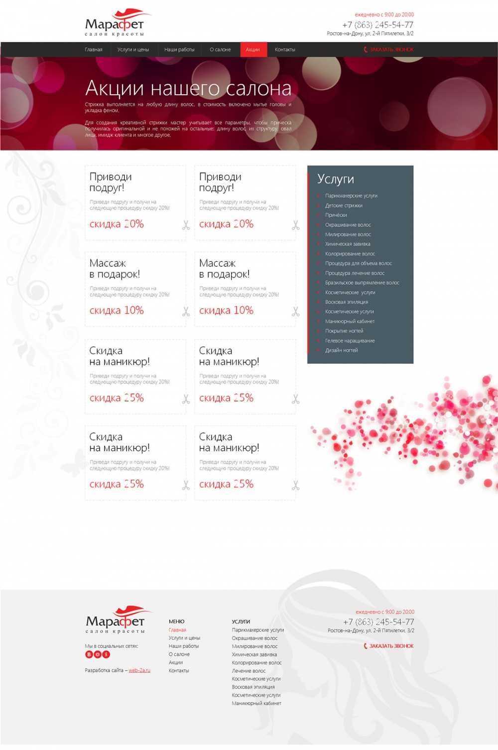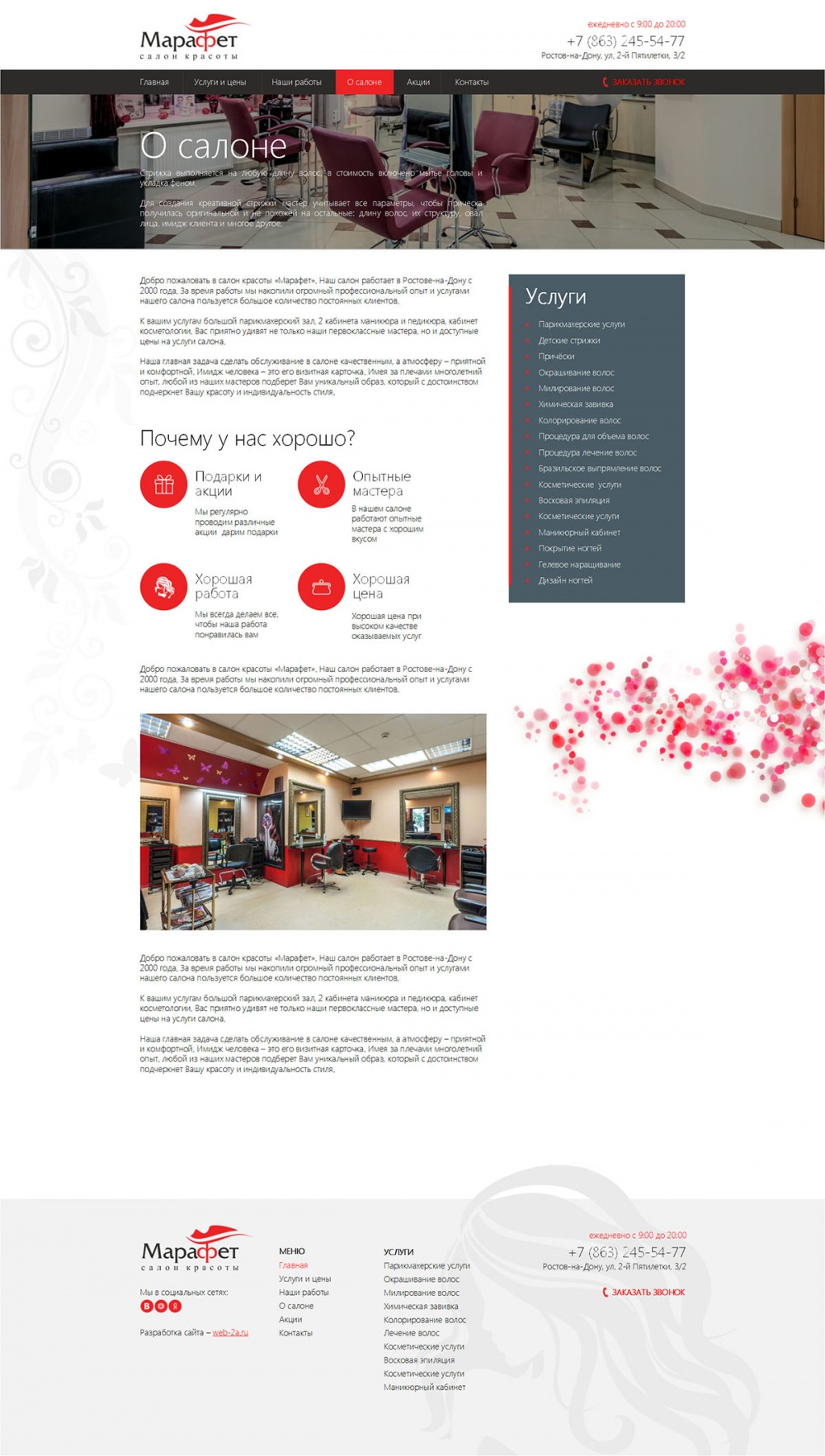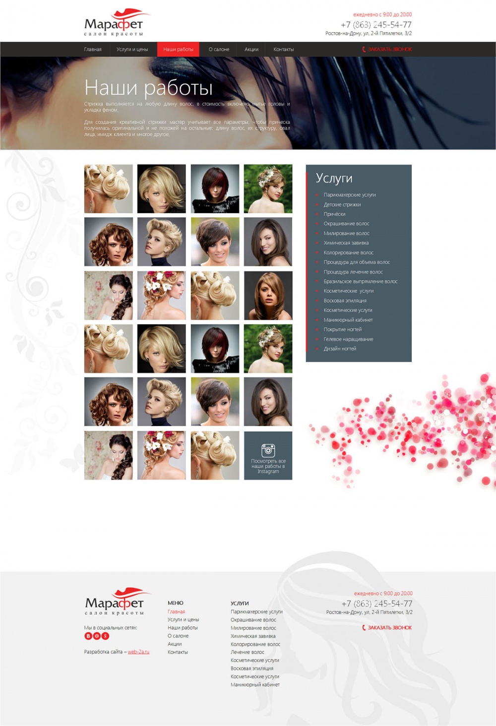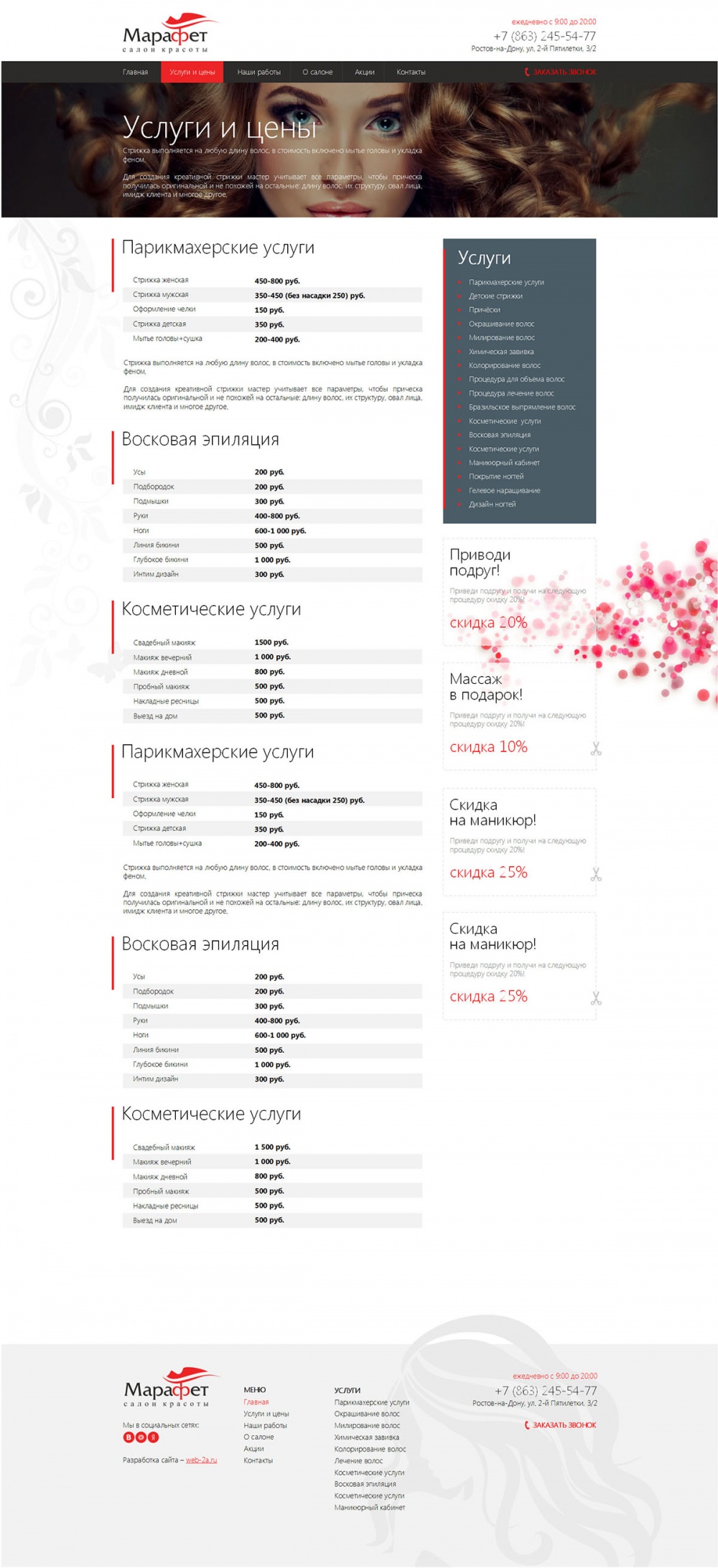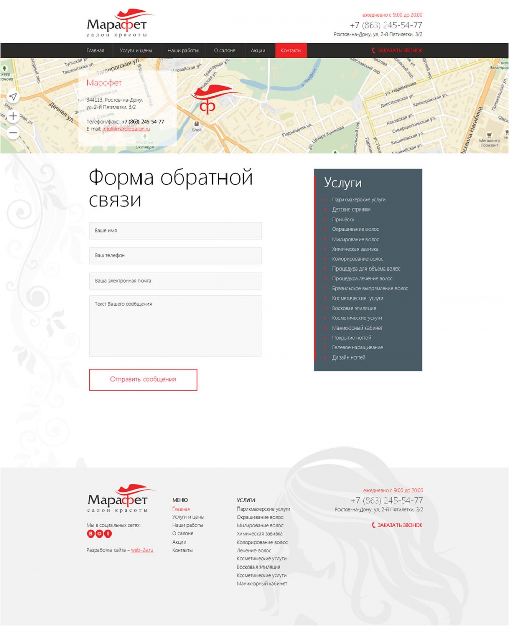 Добро пожаловать в салон красоты «Марафет». Наш салон работает в Ростове-на-Дону с 2000 года. За время работы мы накопили огромный профессиональный опыт и услугами нашего салона пользуется большое количество постоянных клиентов.