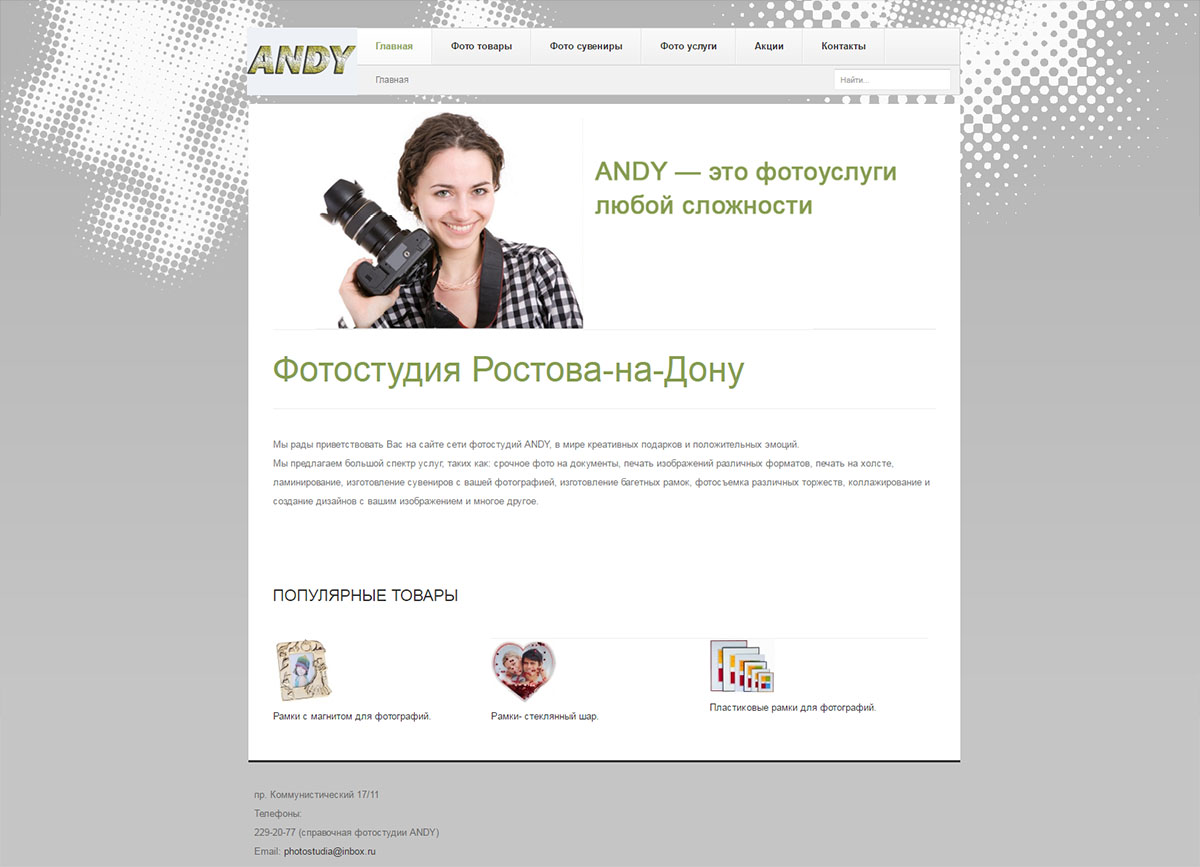 Фотостудия ANDY предлагает большой спектр услуг, таких как: срочное фото на документы, печать изображений различных форматов, печать на холсте, ламинирование, изготовление сувениров с вашей фотографией, изготовление багетных рамок, фотосъемка различных торжеств, коллажирование и создание дизайнов с вашим изображением и многое другое.
