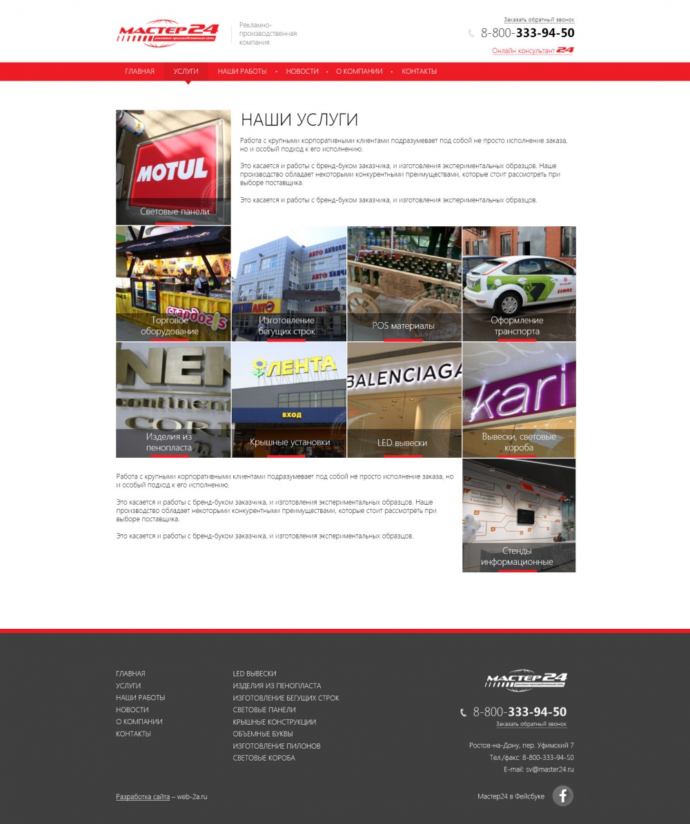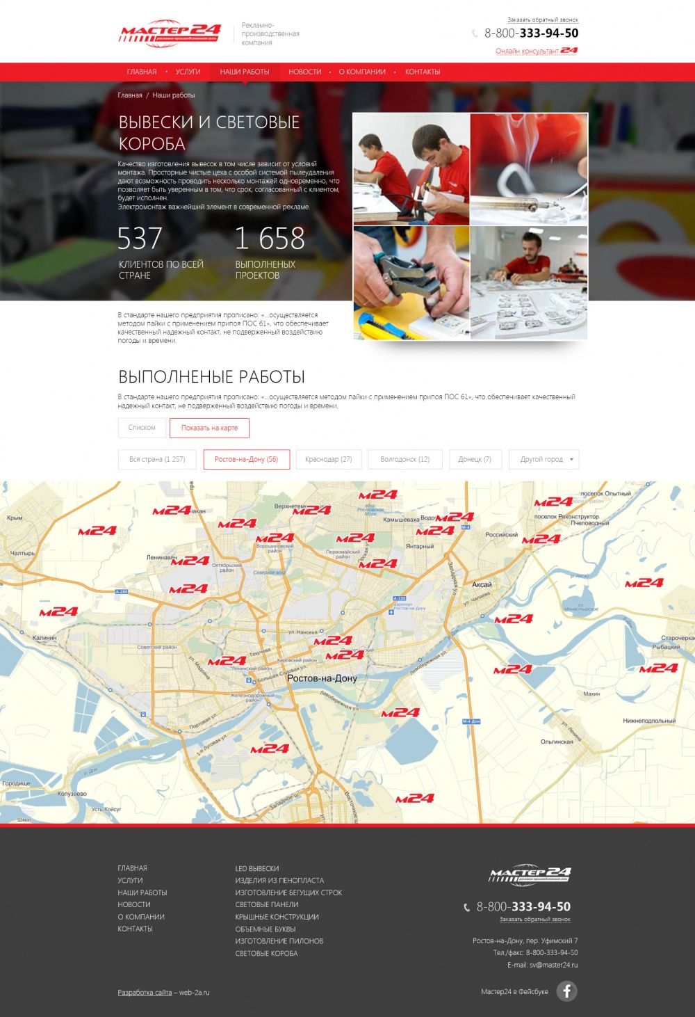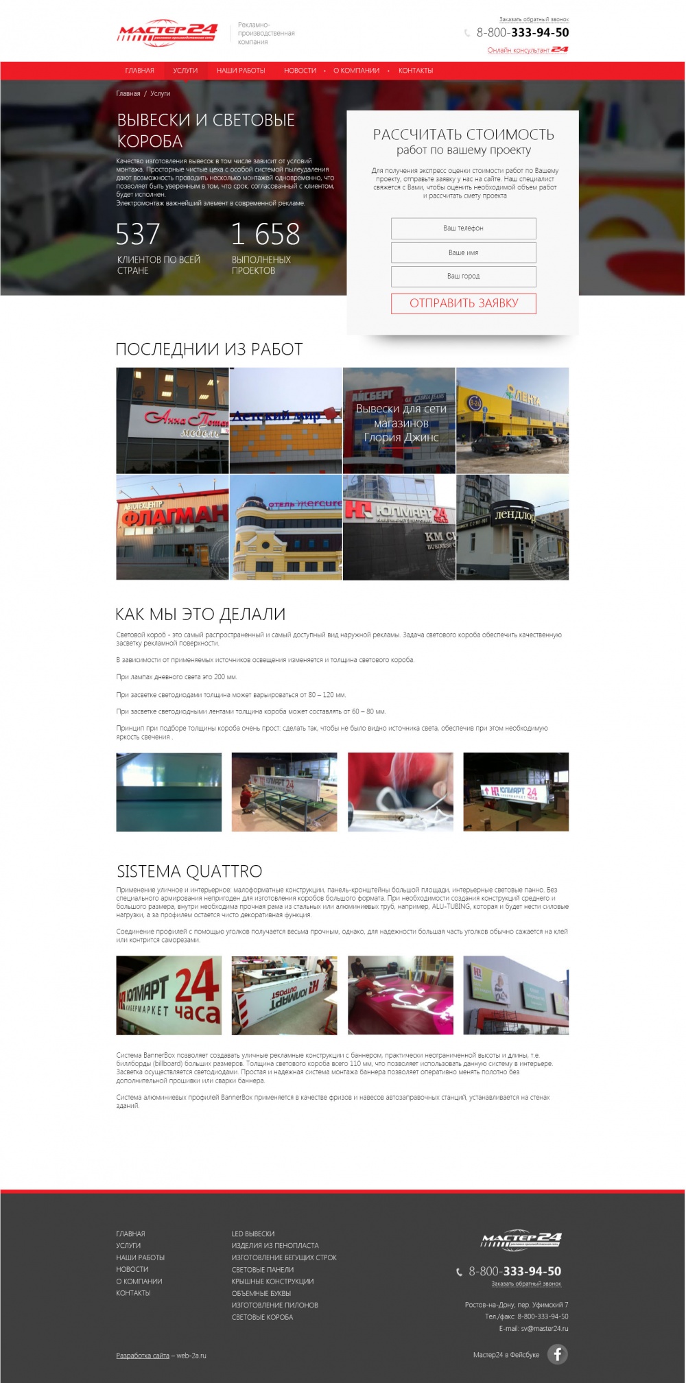 Компания Мастер24 изготавливаеть стенды, вывески и наружную рекламу любого уровня сложности. Предлагает широкий перечень услуг, включая дизайн рекламной продукции, её производство, а также установку.